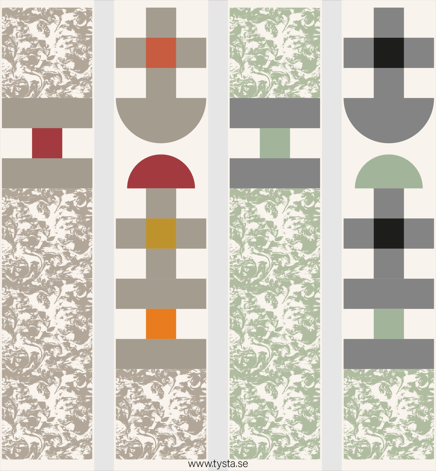 Med inspiration från 50-talets formspråk och grafiska uttryck har vi designat moduler, vepor, väggtextil, rumsdelare samt unika verk.